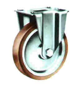 Roulettes bandage polyuréthane dureté shore 95, moulé sur corps en polyamide 6 (Voir roues série A), pour fortes charges, monture en tôle d'acier estampée, forte épaisseur, finition zinguée chromatisée, pivot central boulonné à la platine, pivotement sur double rangée de billes traitées, protégé par un cache poussière circulaire en plastique.