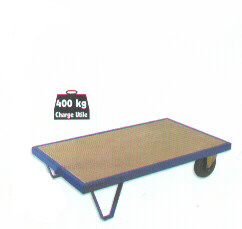 Poids : 30 Kg Dimensions utiles : 1150 x 700 x 285 mm Dimensions hors tout : 1150 x 700 x 285 mm Roues bandage caoutchouc : Ø 200 x 50 mm Construction tubulaire, un plateau bois Deux roulettes fixes, pieds Train baladeur en option Charge utile de 400 Kg Plate-forme référence N° - 15.030PF
